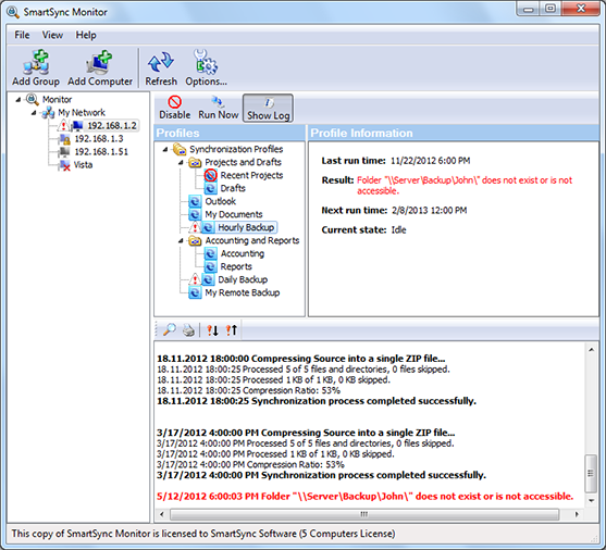 - Нажмите клавишу Enter. SmartSync Monitor соединится с удаленным компьютером и покажет подробную информацию о профилях.